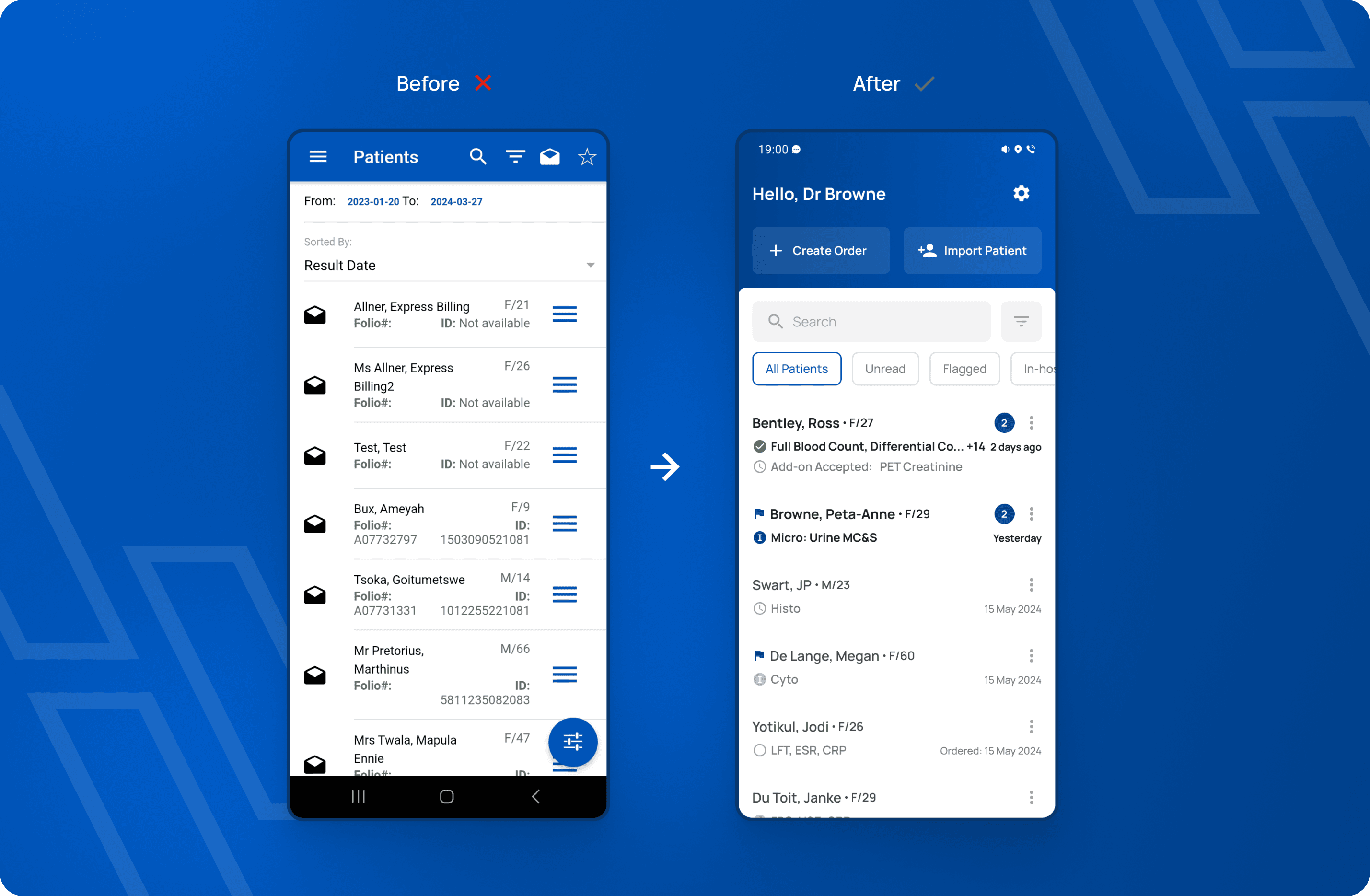 The redesigned Patient screen. The top header and the "Create Order" FAB collapses to provide more screen real estate.