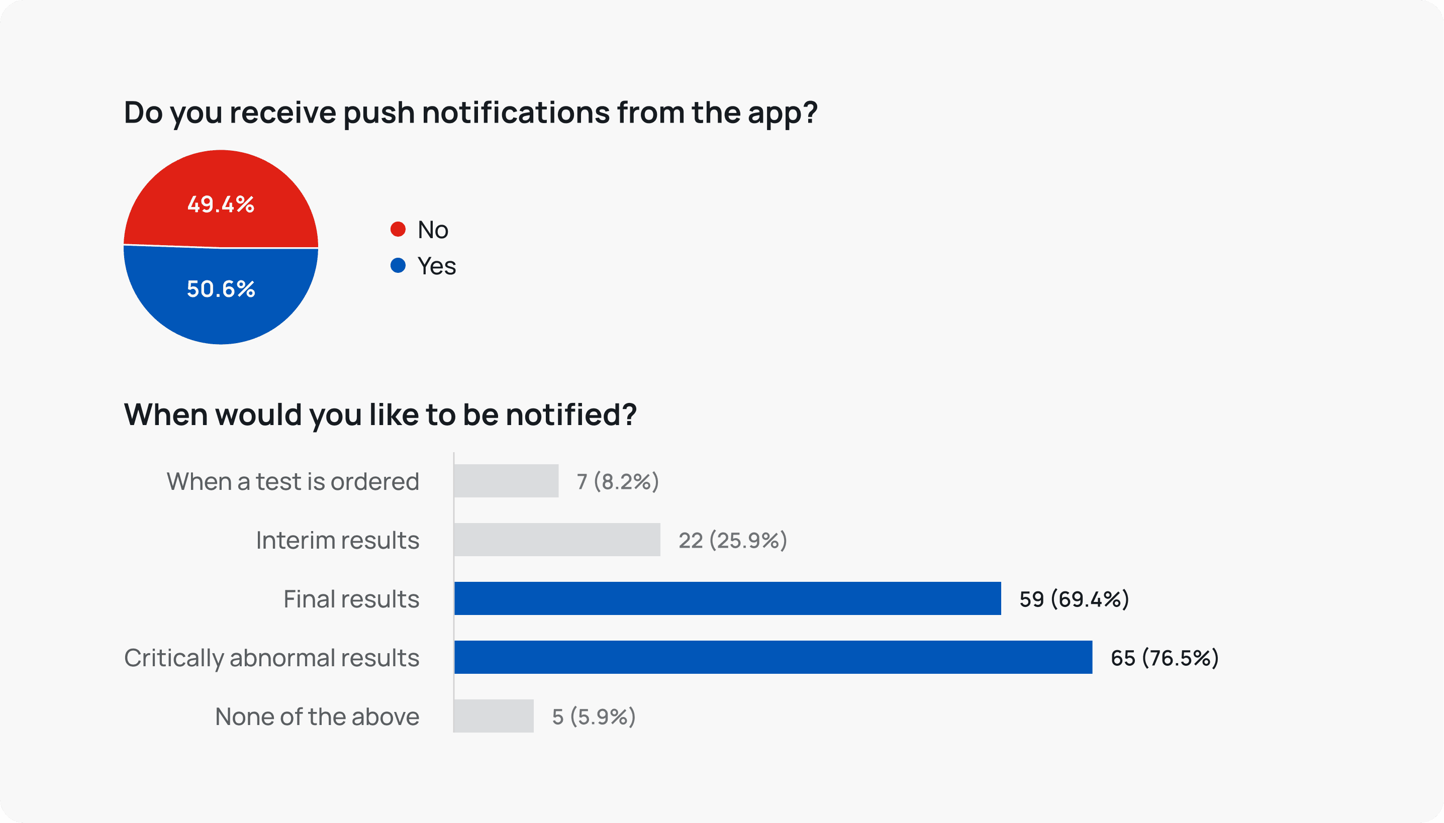 Survey responses showing that at least half of users had turned off notifications, and that the majority only wanted to be notified for Final and Critically Abnormal results.