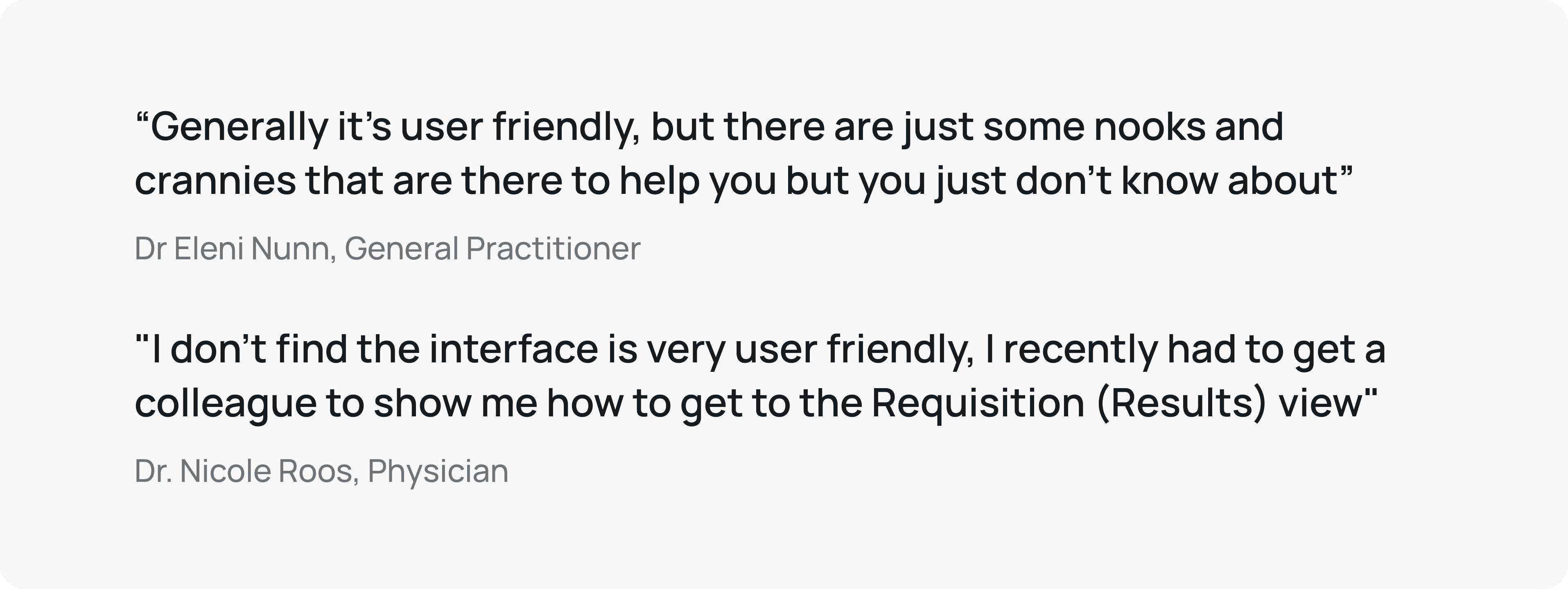 Interview quotes highlighting the frustrations doctors had with navigating the interface.
