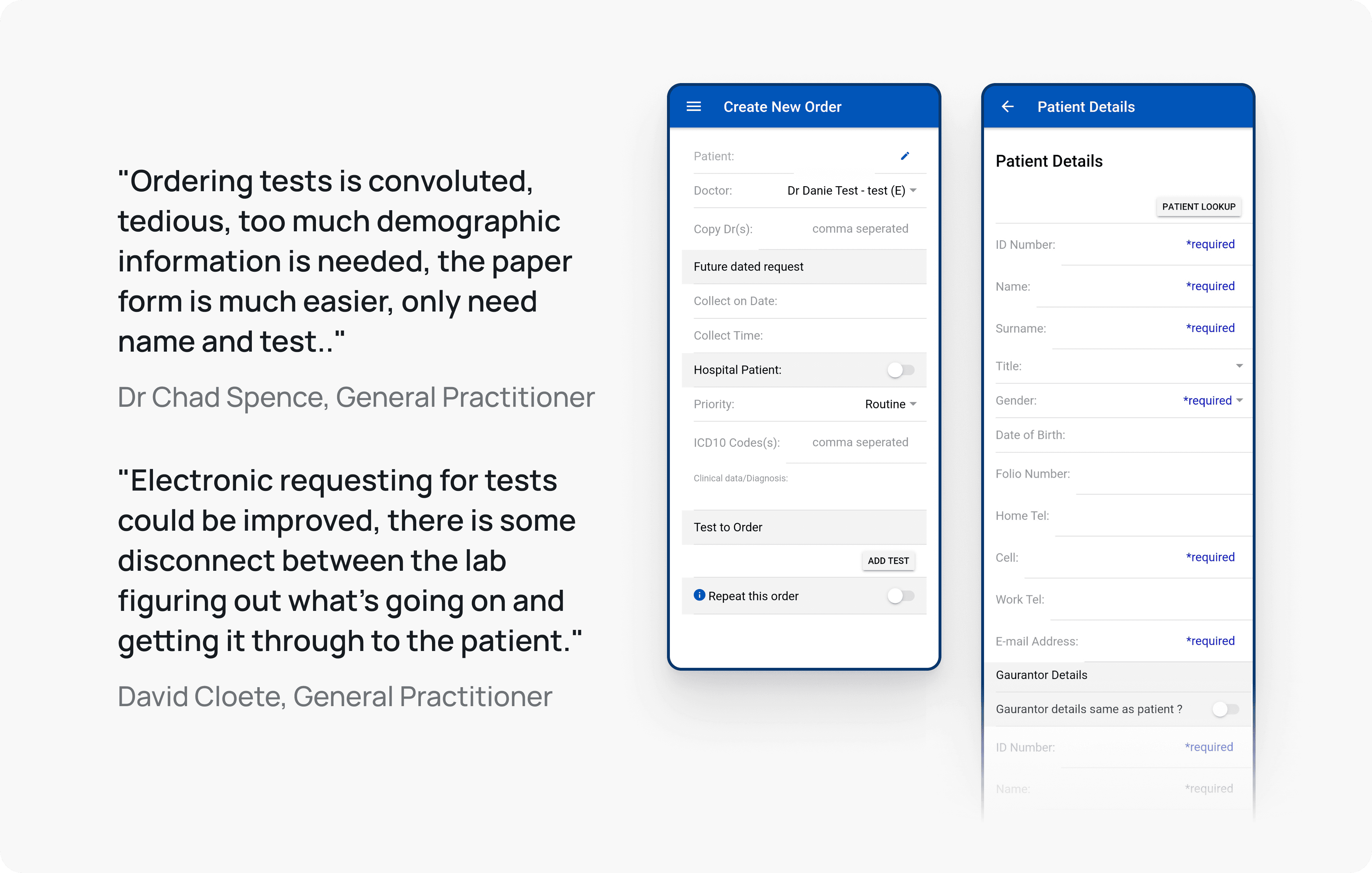 Quotes showing doctor's frustrations & screenshots of the previous create order process.