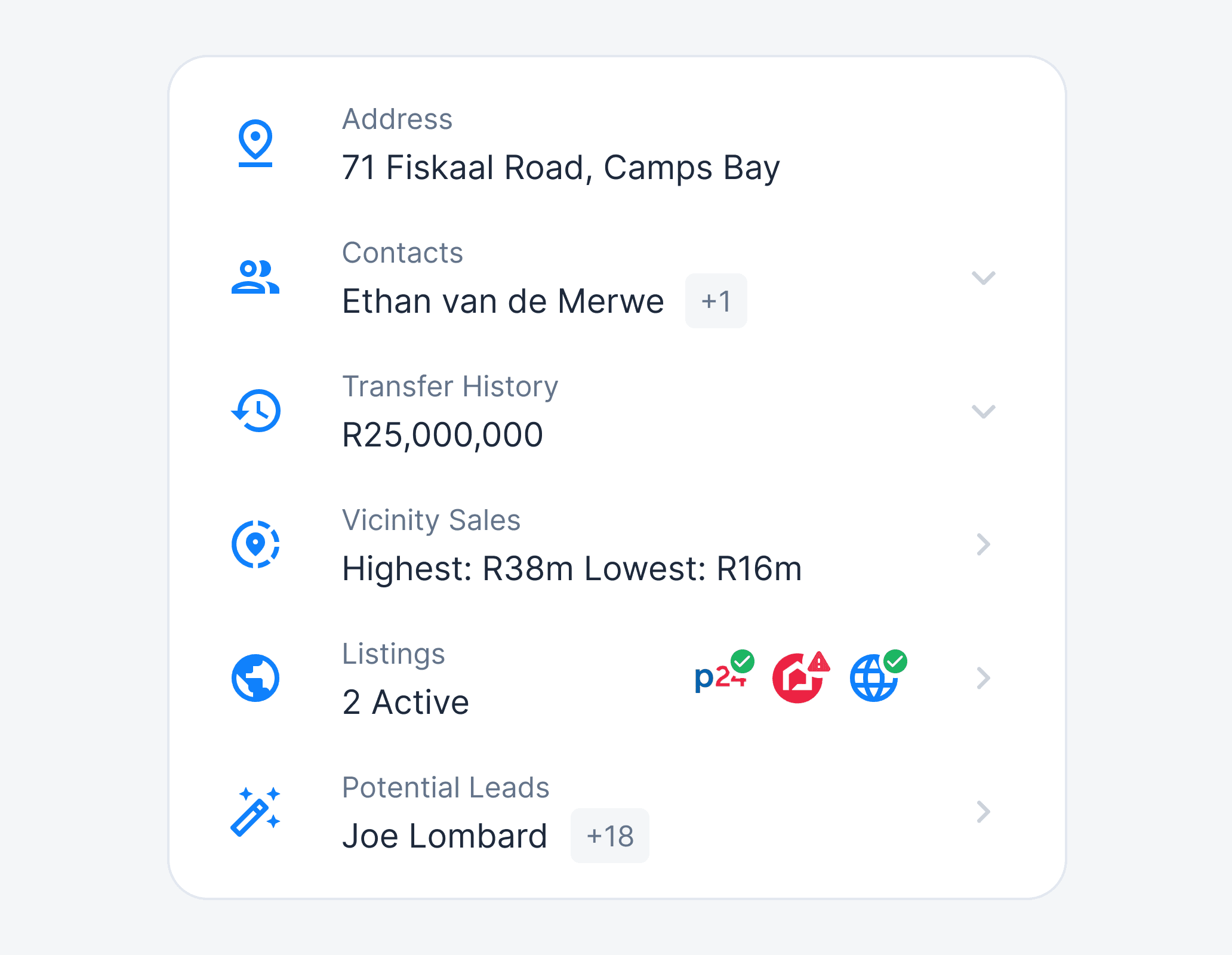 Agents can pull deed information for any property in South Africa, turning cold areas into warm prospecting opportunities without leaving the platform.
